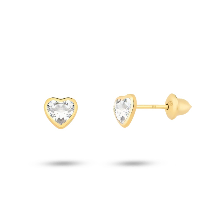 Brinco infantil coração em Ouro Amarelo 18K com Zircônia branca