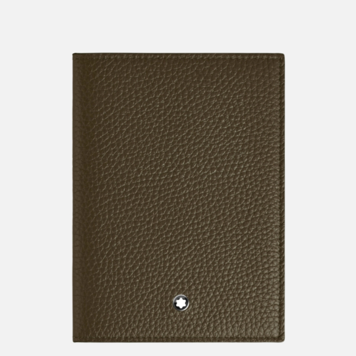 Estojo refinado para passaporte, confeccionado em couro grain de bezerro na tonalidade khaki. Conta com compartimento aberto para o passaporte e bolso extra para boarding pass ou recibos, ideal para viagens com elegância e praticidade.