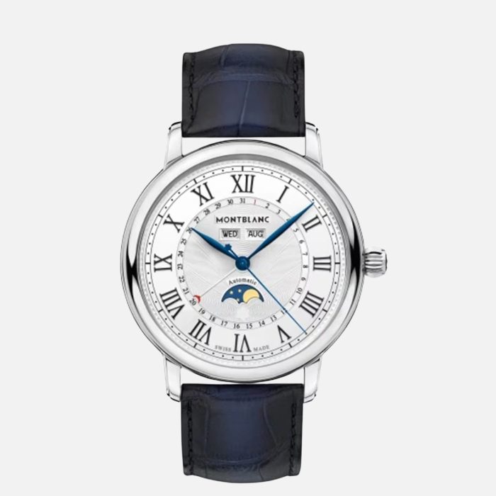 O Montblanc Star Legacy Full Calendar inspira-se no legado da Minerva e nos relógios de bolso do fim do século XIX. A caixa em aço de 42 mm abriga o calibre automático MB 29.12, que exibe horas, minutos, segundos, dia, data, mês e fase da lua. No mostrador prateado, o guilloché “exploding star” da Montblanc destaca numerais romanos, ponteiros em folha e a minuteria tipo “railway track”. A data é indicada por ponteiro com ponta em crescente vermelho, enquanto dia e mês surgem em janelas na metade superior do mostrador; a fase da lua ocupa a metade inferior, compondo um layout equilibrado e de alta legibilidade. :contentReference[oaicite:1]{index=1}