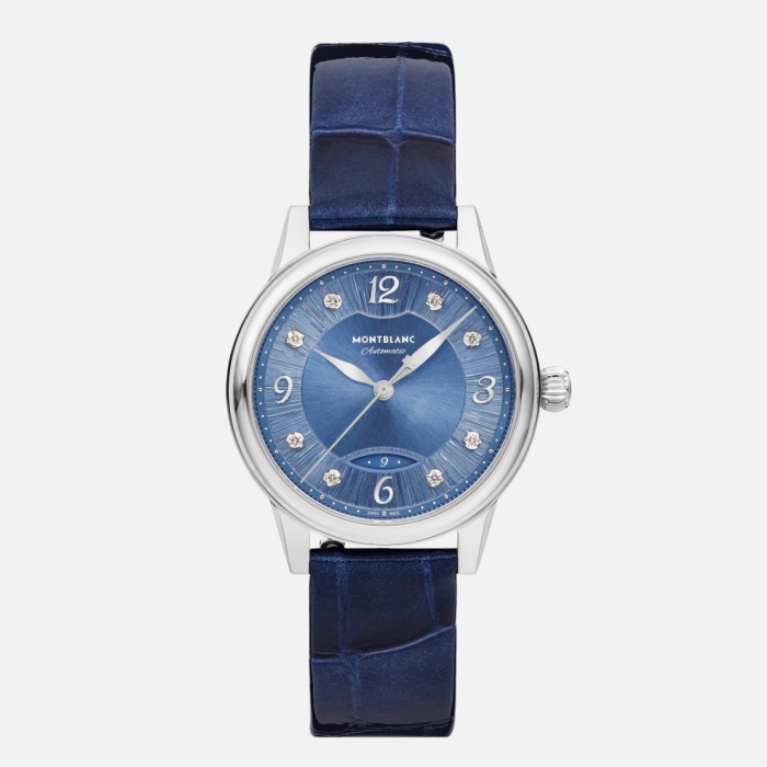 O Bohème Automatic Date de 30mm traduz a estética feminina clássica da Montblanc em um relógio discreto e refinado. A caixa em aço inoxidável abriga mostrador azul com padrão “filet sauté”, ponteiros elegantes e marcadores que favorecem a leitura.